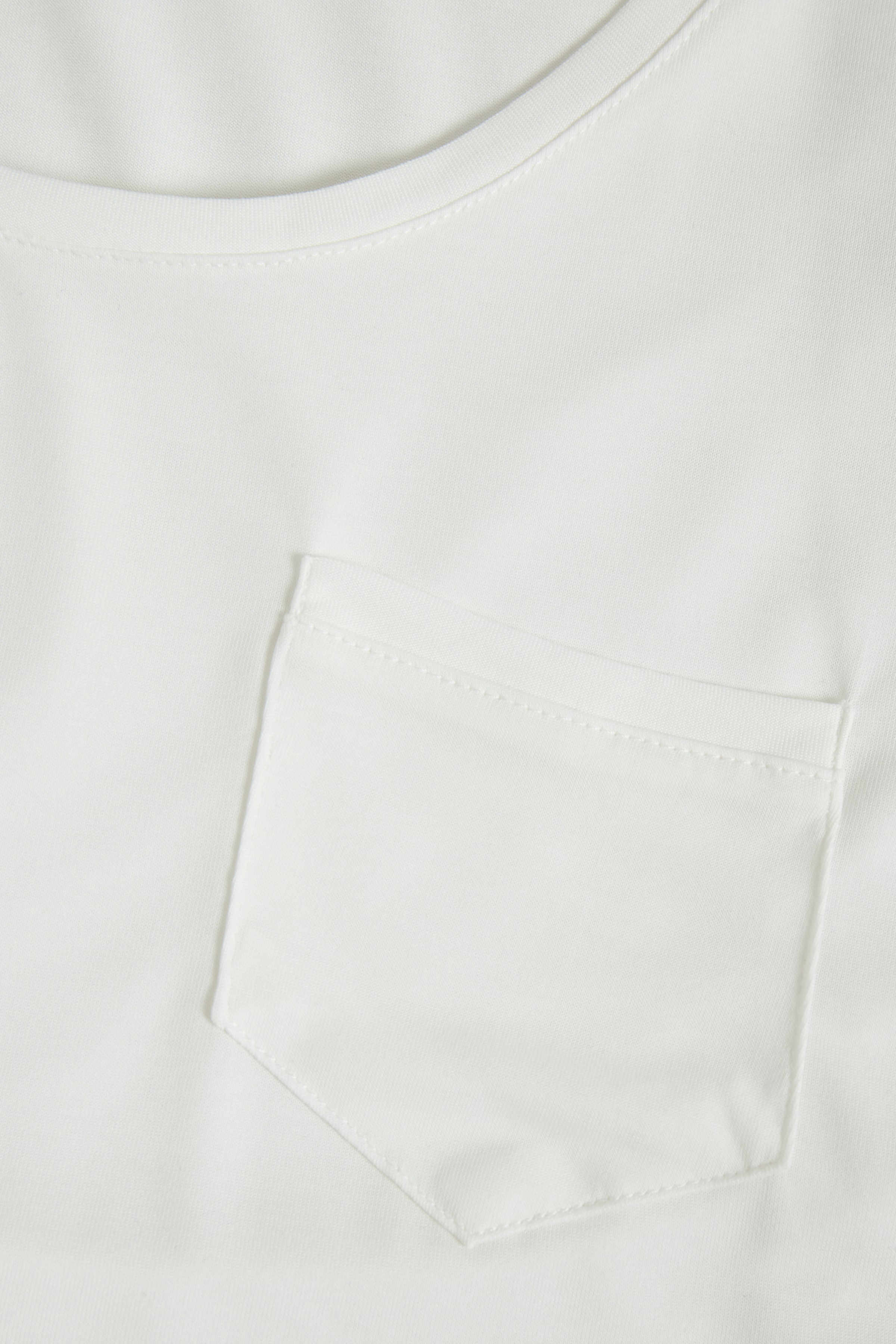 T-shirt with short sleeves, round neckline, pocket on the right chest and ribbing at the neck. The t-shirt is in a woven jersey quality and has a normal fit. The model is wearing a size M.