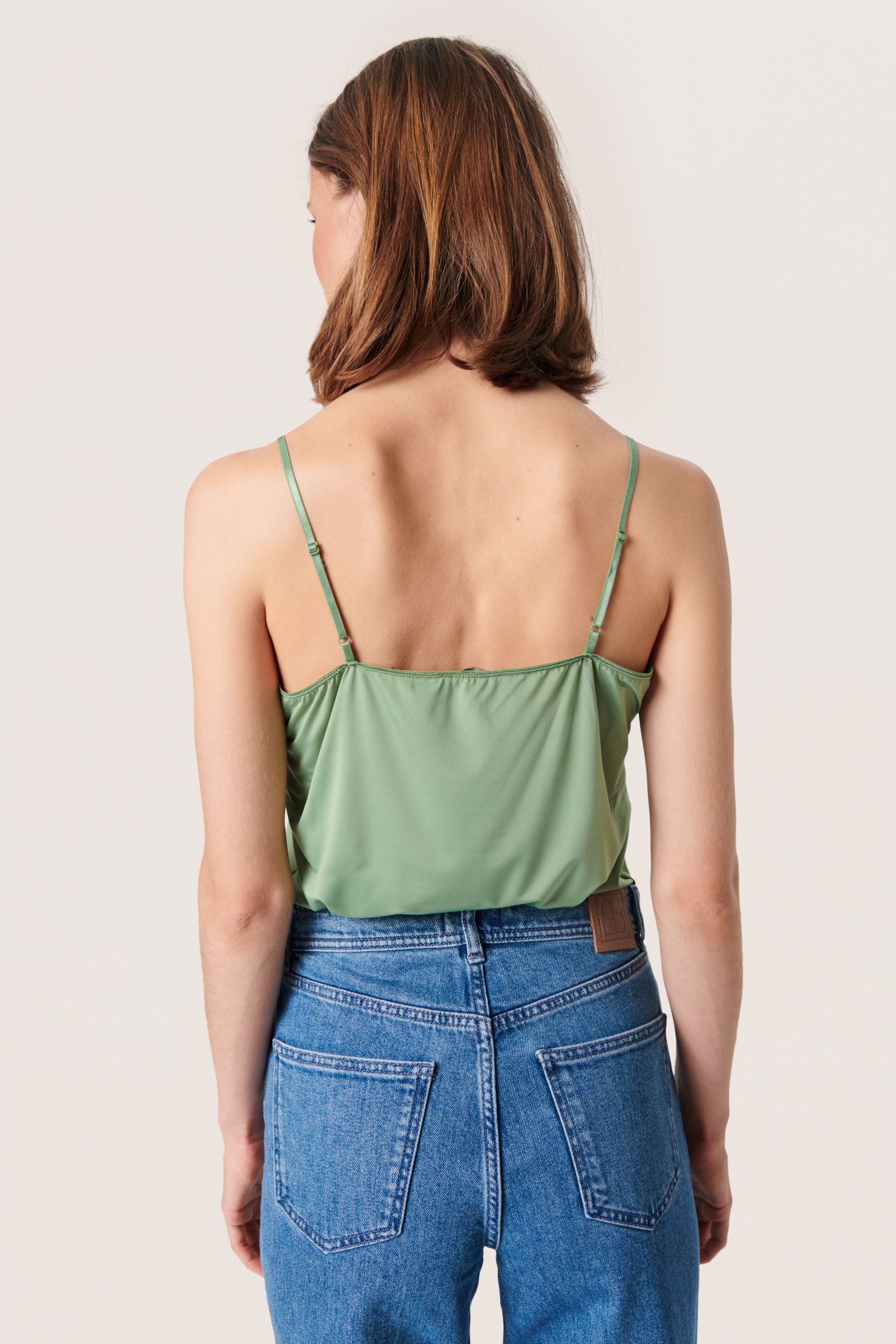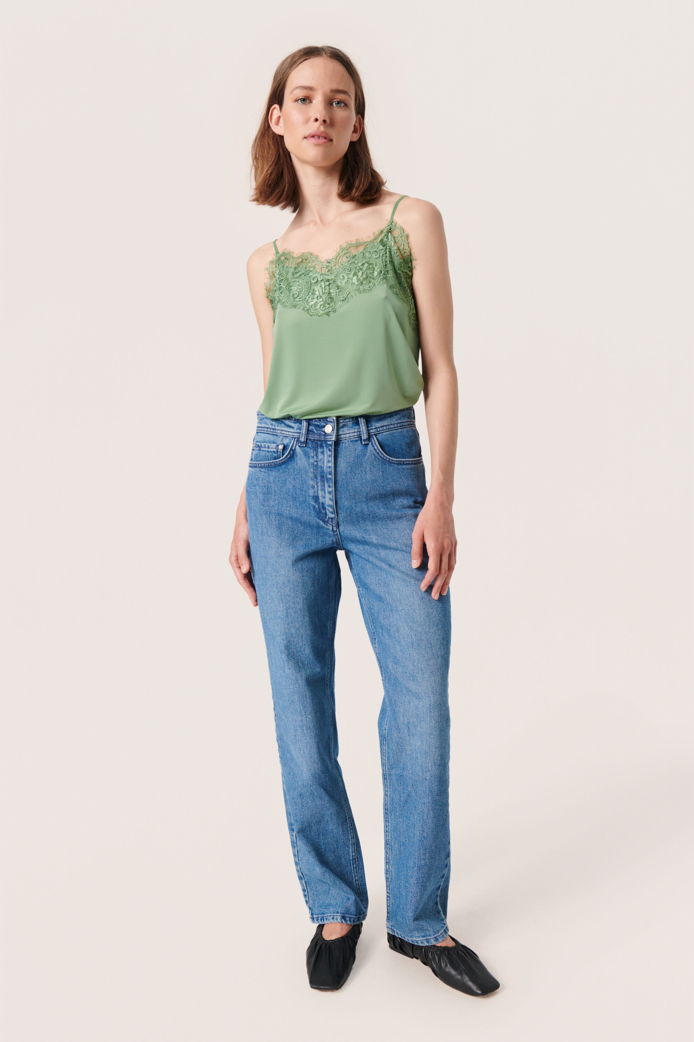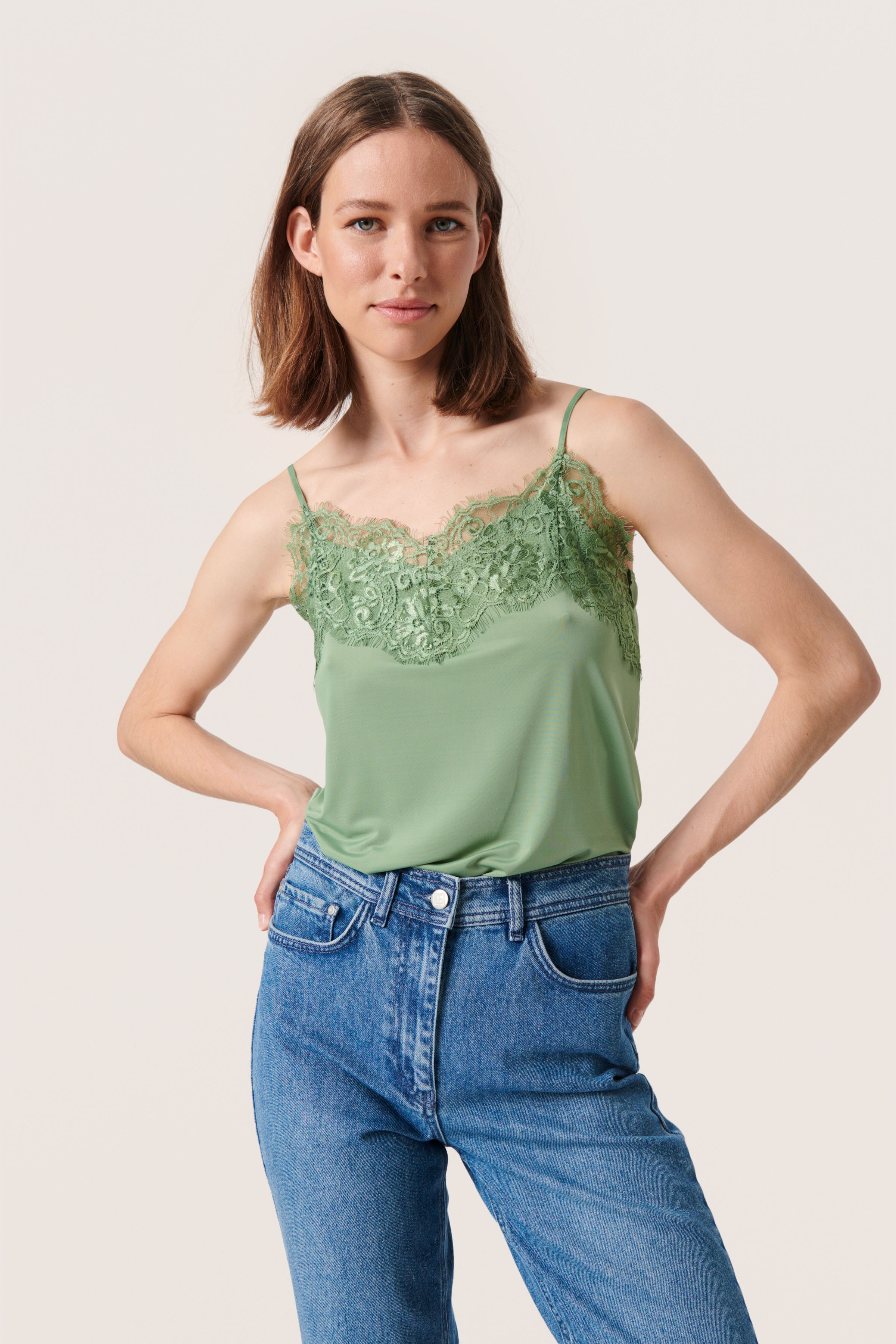 Strap top with a wide lace border at the neckline and adjustable straps.