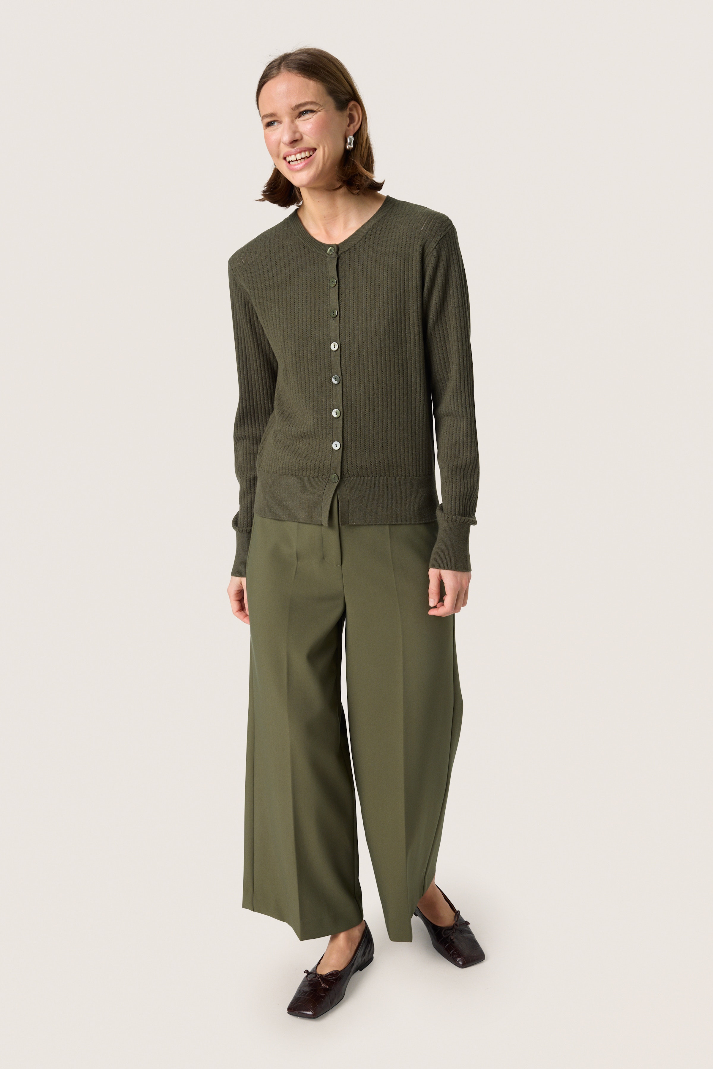 Olivgrüne Strickjacke mit Rippenstruktur, Rundhalsausschnitt und durchgehender Knopfleiste. Die körpernahe, elastische Passform eignet sich ideal zum Layern oder solo tragen. Model ist 178 cm groß und trägt Größe M