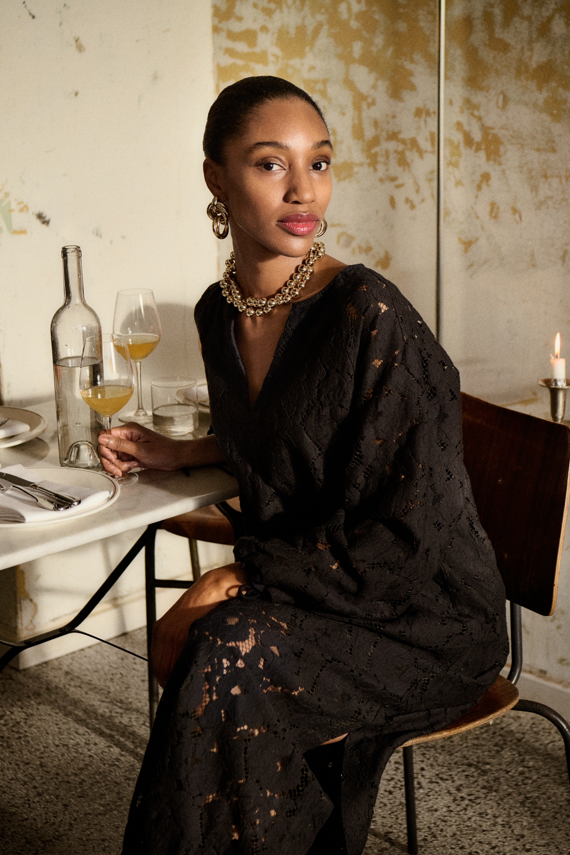 Langes Spitzenkleid mit V-Ausschnitt, weiten Ärmeln und Bindebändern an den Handgelenken. In klassischem Schwarz und mit lockerer Passform – für einen eleganten und zeitlosen Look. Model ist 177 cm groß und trägt Größe M.