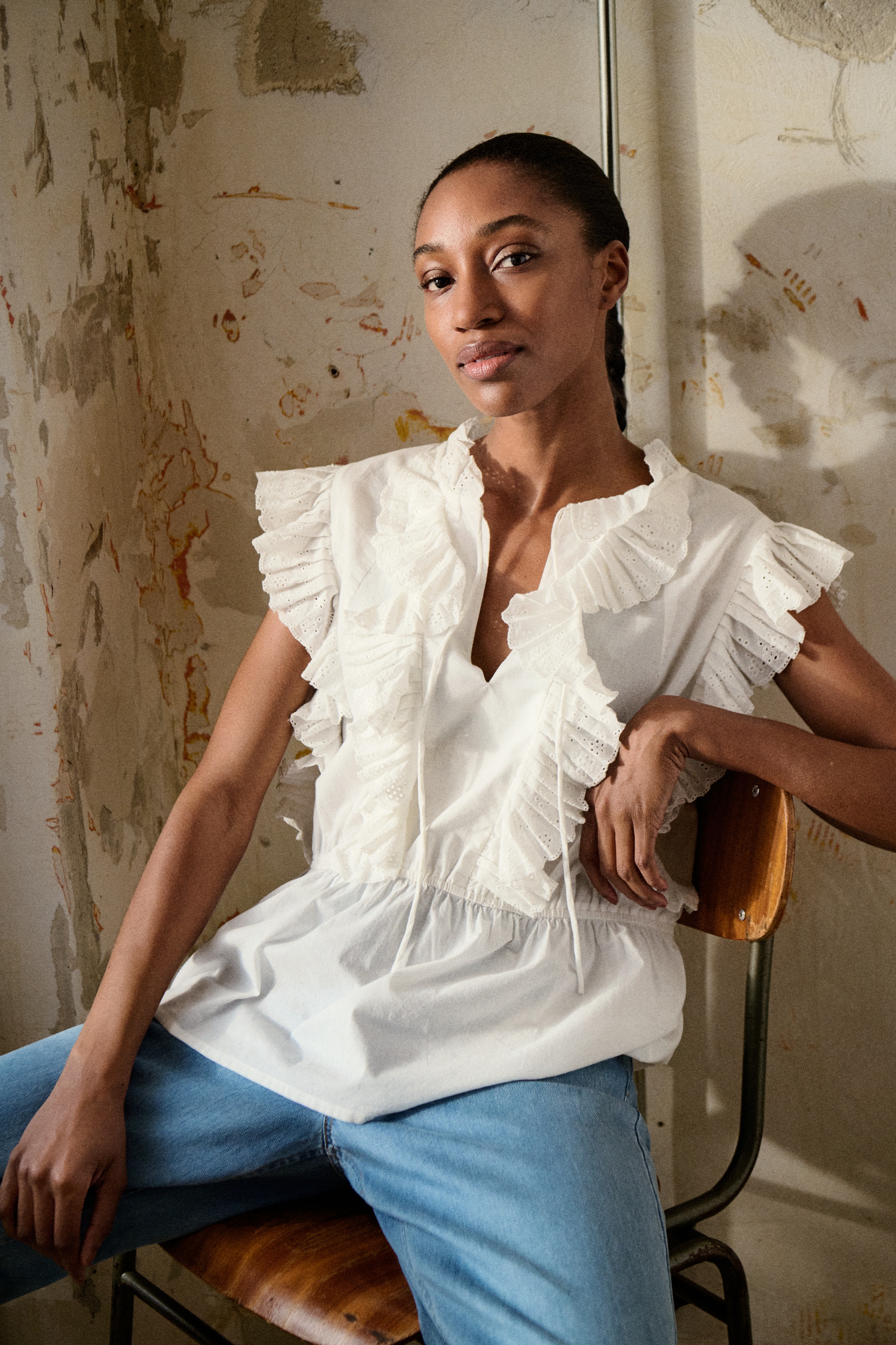 Sleeveless blouse in crisp white with feminine ruffles and embroidered front details. The gathered waist and keyhole neckline create a light and elegant silhouette for everyday or occasion wear. Model wears size M.